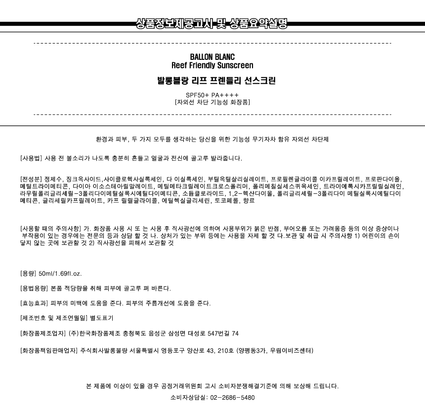 Ballon Blanc Reef-Friendly Sunscreen 50ml / 발롱블랑 리프 프렌들리 선스크린 50ml