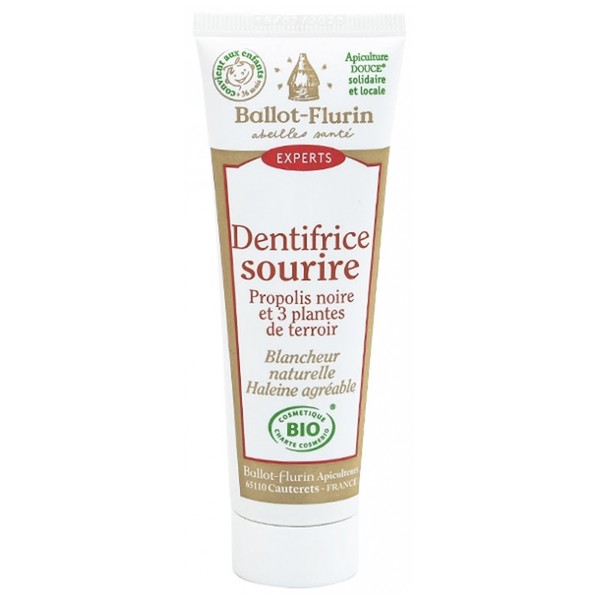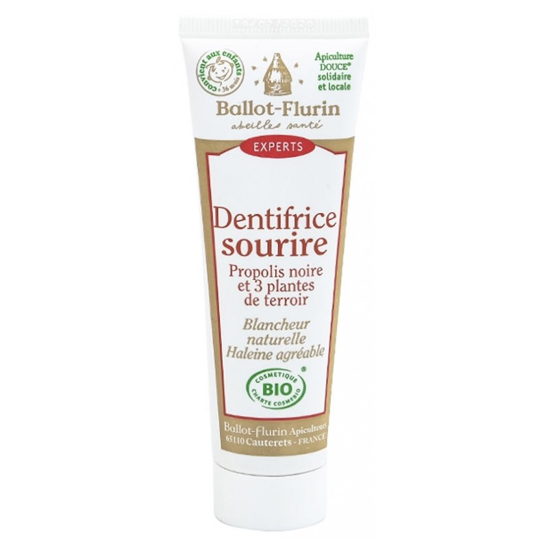 Ballot-Flurin Organic Smile Toothpaste 50 ml is a toothpaste which assures a natural whiteness and a fresh breath. The mild polishing of natural calcium carbonate respects the tooth enamel and helps to remove stains (tea, coffee, tabacco...). Black propolis, with its purifying action, revitalises gums. The 3 plants of our regions give a natural breath and soothes gum. This toothpaste respects the balance of the mucosa.