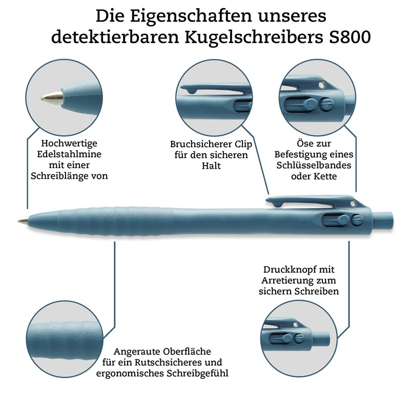 - Material: the shatterproof and shatter-proof ballpoint pen S800 is made of metal detectable, X-ray-capable, smooth and dirt-repellent polypropylene (PP). Thanks to the material structure, it is quick and easy to clean. Polypropylene is chemically resistant to aqueous alkalis, diluted organic acids, diluted mineral acids, weak alkalis, acetone, alcohols and mineral lubricants.