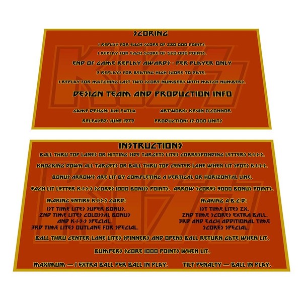 Bally Kiss Pinball Custom Apron Instruction Cards Hi Resolution