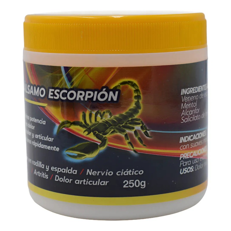 Alivia eficazmente dolores en espalda, rodillas, cuello, brazos, piernas y más gracias a su fórmula con veneno de escorpión, mentol, alcanfor y salicilato de metilo. Este bálsamo actúa rápidamente sobre músculos y articulaciones afectadas por artritis, lumbalgia, ciática, contracturas y esguinces.