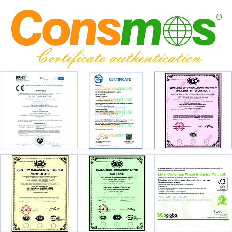 - FULL BIRCH PLYWOOD(100%): The whole plant EO is environmentally friendly, responsible for the environment and customers; fully dried, fully connected core, three times molding, three times sanding, clear layers, environmental protection and health;import Birch core veneer and brich veneer from Baltic ;consmos plywood have been certified by FSC、CARB P2、EPA、CE、EUTR