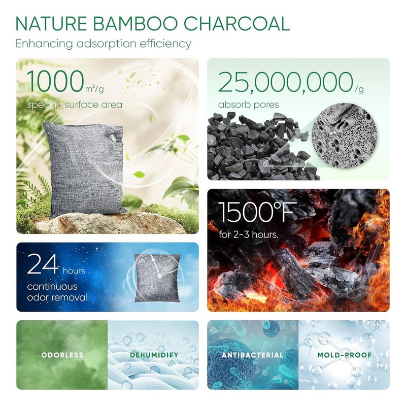 - ODOR CONTROL POWER FROM 25,000,000/G ADSORPTION PORES - Activated bamboo charcoal engineered through precise 1500℉ carbonization, boasts 2-50nmm Micrometres and nano-sized pores, providing a specific area of 1000 square meters per
