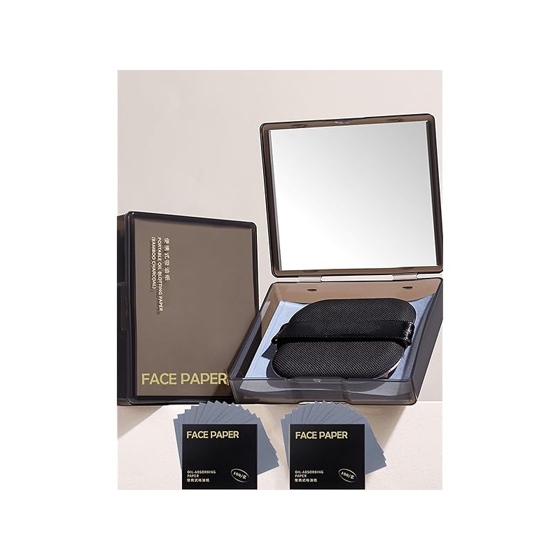 Bamboo Charcoal Oil Blotting Paper - 300 Sheets w/Mirror, Puff & Refills, Absorbs Excess Face Oil, Controls Shine, Gentle for Makeup Use