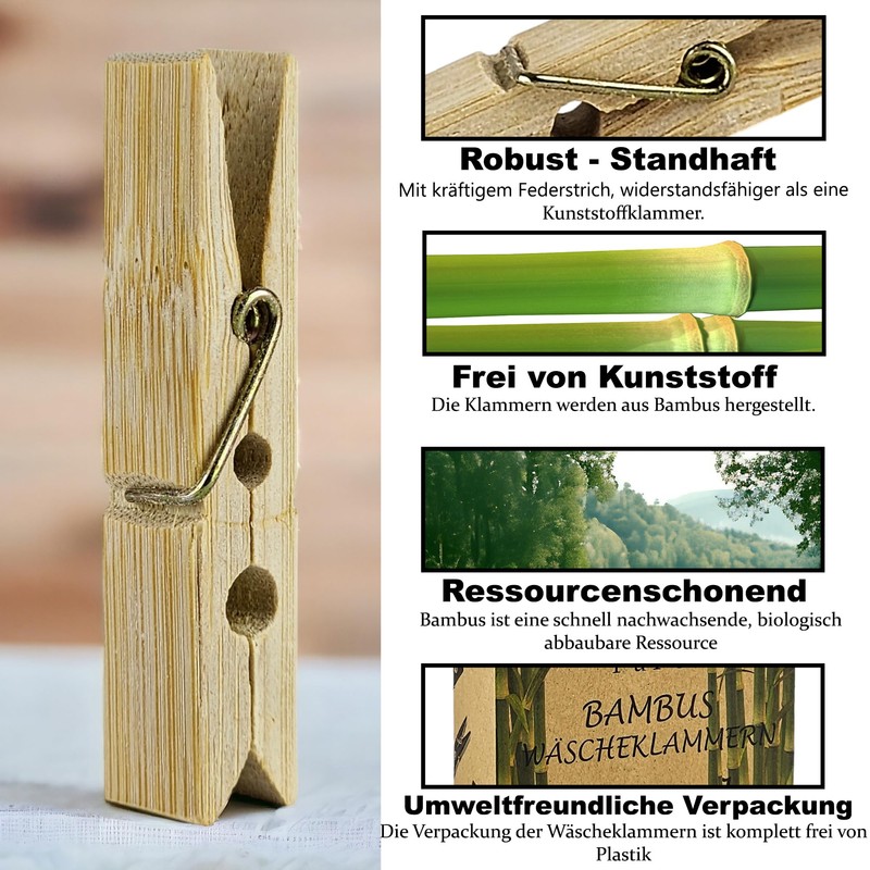 Discover an environmentally friendly alternative for your laundry care repertoire with our high-quality bamboo clothespins. Made from sustainable natural material and equipped with robust metal springs, they offer a durable solution for hanging your laundry. These practical clips are not only biodegradable, but also ecological and functional.