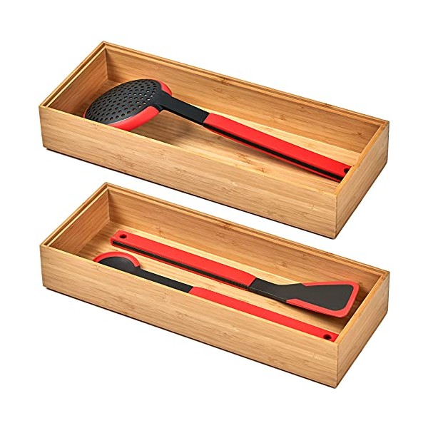 Bamboo Kitchen Drawer Organizer Boxes with Anti-Skid Silicone Feet, 2pcs Stackable Storage Bins for Kitchen Utensils & Silverware & Desk Drawer & Makeup, Tools Holder, 15”L x 6”W x 2.5”D Each