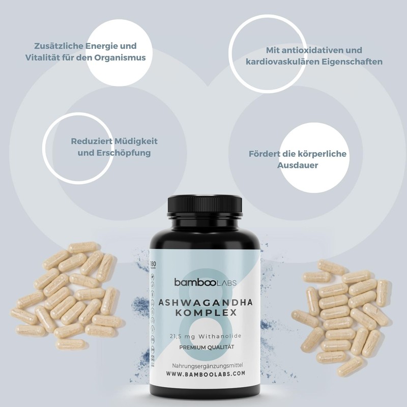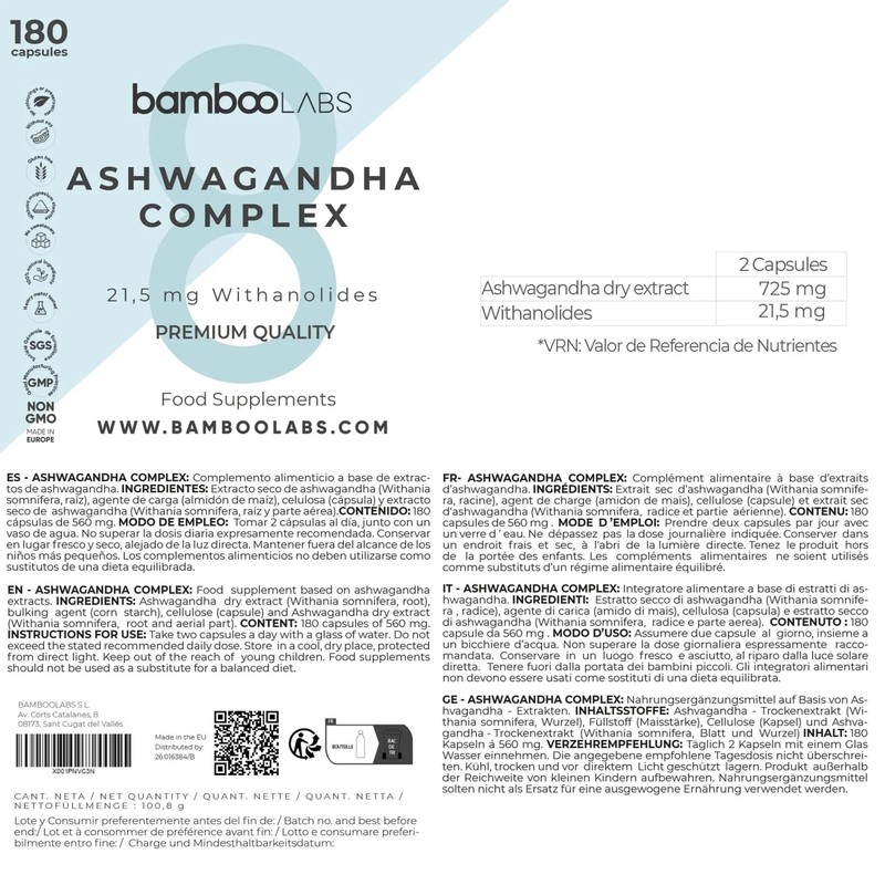 - BAMBOO LABS organic ashwagandha capsules: we pursue the clear goal of giving you the necessary means to achieve your ideal lifestyle with our Ashwagandha. We work according to the ISO 22000 standard, which certifies that we meet all food safety requirements. Made in Europe (Spain).