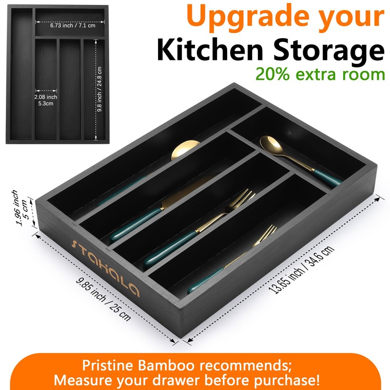 - 【Dimension】Use a bamboo cutlery organizer to store your kitchen utensils and make your kitchen look beautiful and tidy.Please measure the size of your drawer to check if it is suitable. Generally speaking, this organizer is suitable for standard sized drawers.15.5 x 9.5 x 1.96 inches
