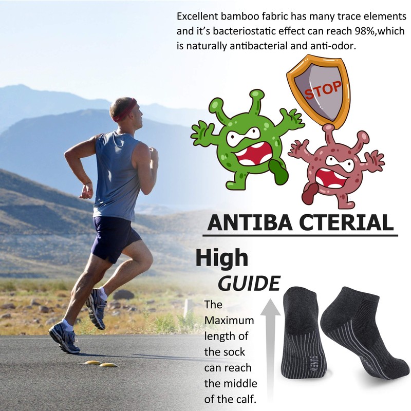 | Material Type: | Made of 80% Bamboo, 15% Polyester, 5% Elastic; Bamboo fiber socks are breathable and durable to keep your feet dry and cool. |