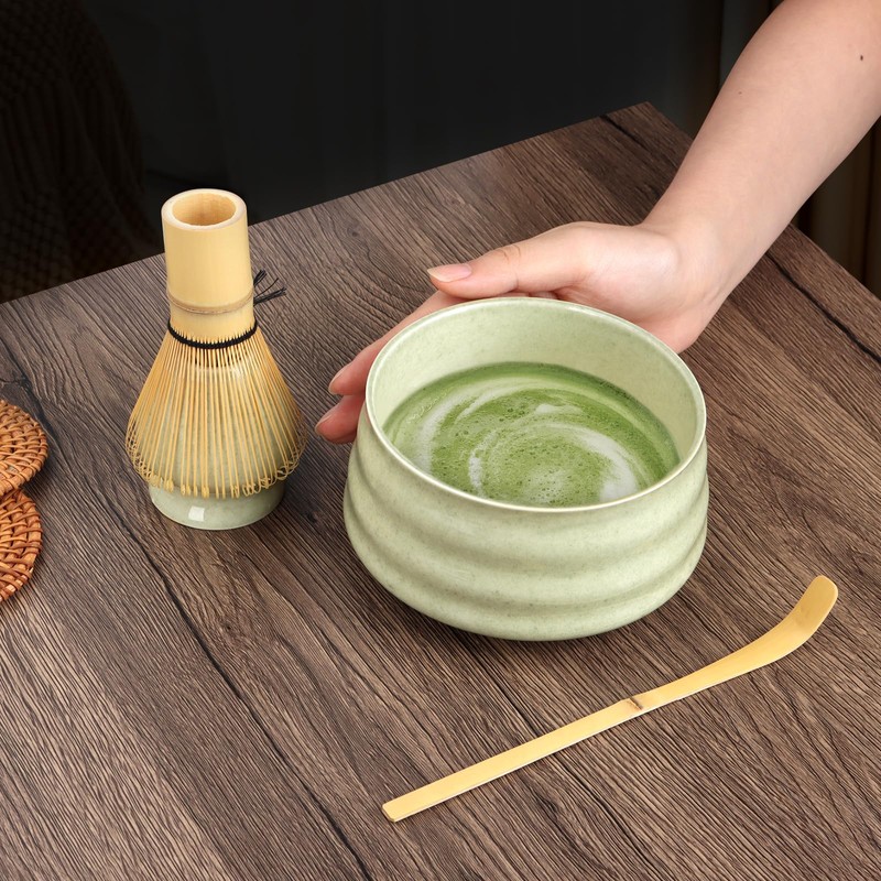 Matcha bowl, tea brush (for mixing and whipping the matcha powder), tea brush stand (tool to place the tea brush) and teaspoon (for removing the matcha powder).