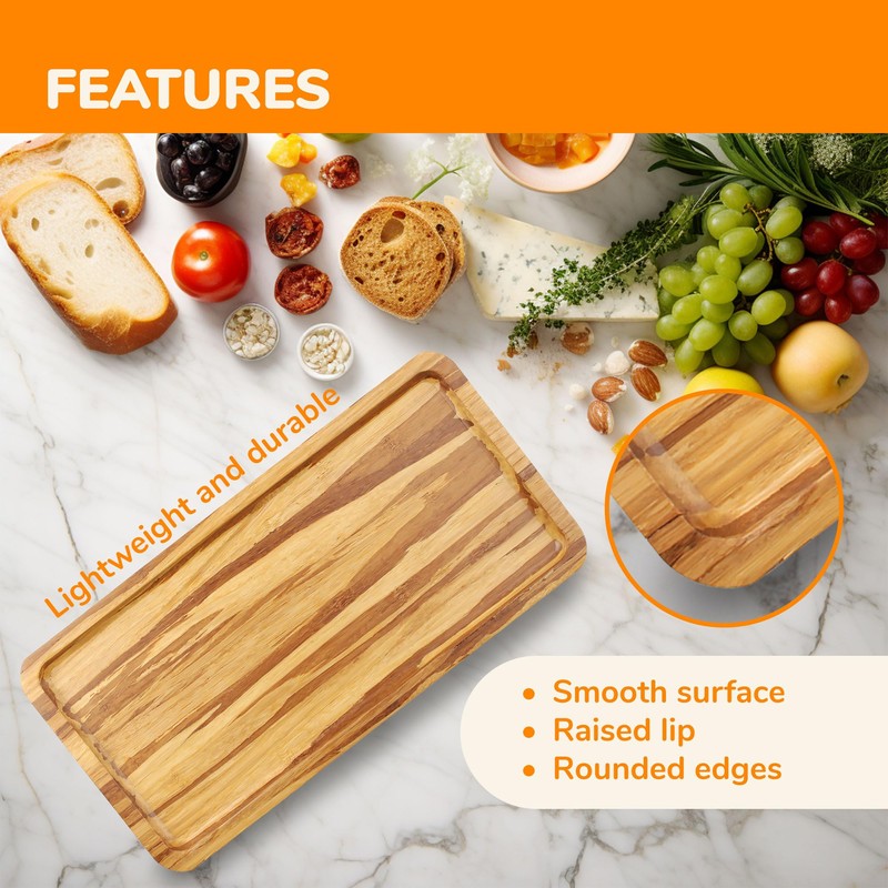 - FEATURES Thin, easy to carry and store. Lightweight yet more durable than most woods. Leak-free rounded edges feature a lip to protect from spills. Smooth, water-resistant base. Compostable and biodegradable