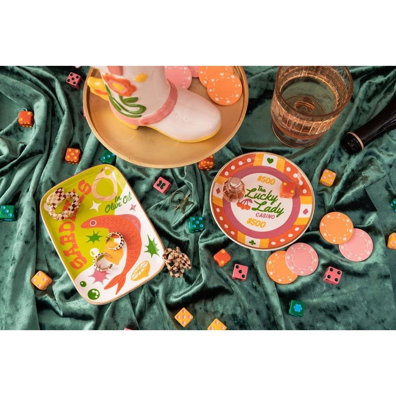 - DESIGN: Take a trip to the Lucky Lady Casino with this shiny ceramic jewelry tray with metallic gold trim; this trinket dish is inspired by a retro casino coin and serves as the perfect catch all for everything from jewelry to after dinner mints