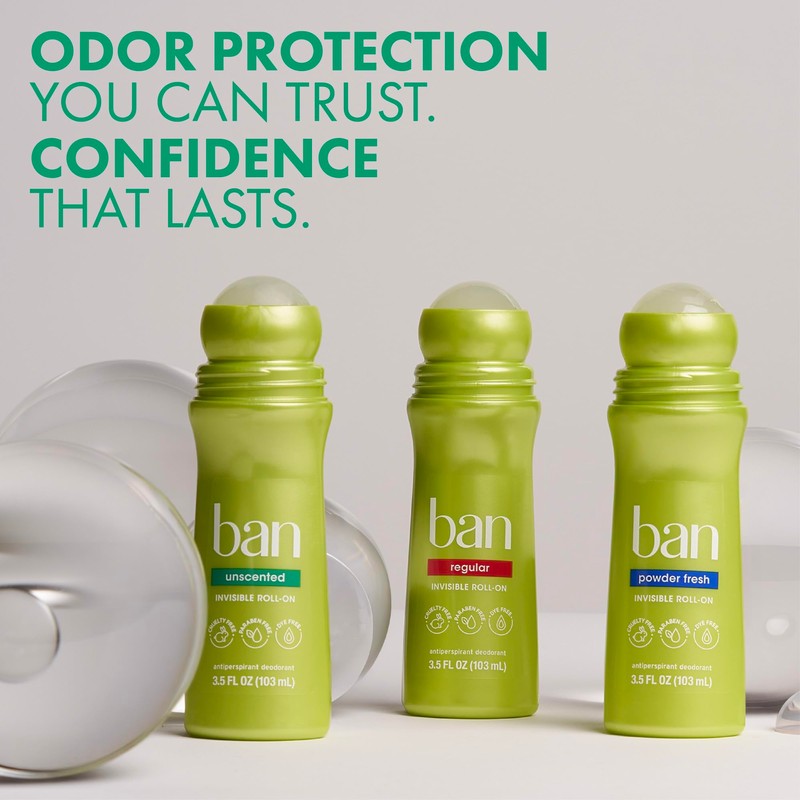 - INVISIBLE DEODORANT - Roll-on Ban Deodorant glides on clear and won't leave white marks on clothes.