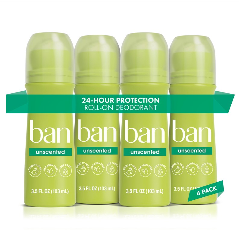 Ban Original Unscented 24-hour Invisible Antiperspirant, 3.5oz Roll-on Deodorant, 4-pack, Underarm Wetness Protection, with Odor-fighting Ingredients