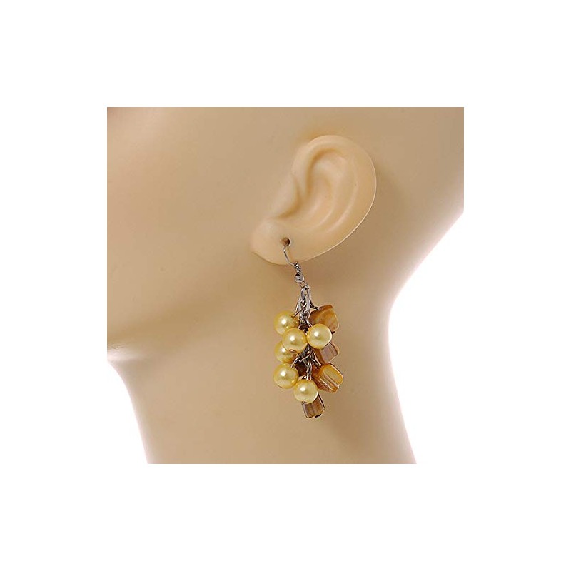 Banana Yellow Glass Bead, Antique Yellow Shell Nugget Cluster Dangle Earrings/Silver Tone/ 60mm Drop