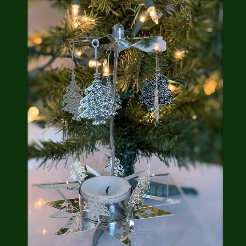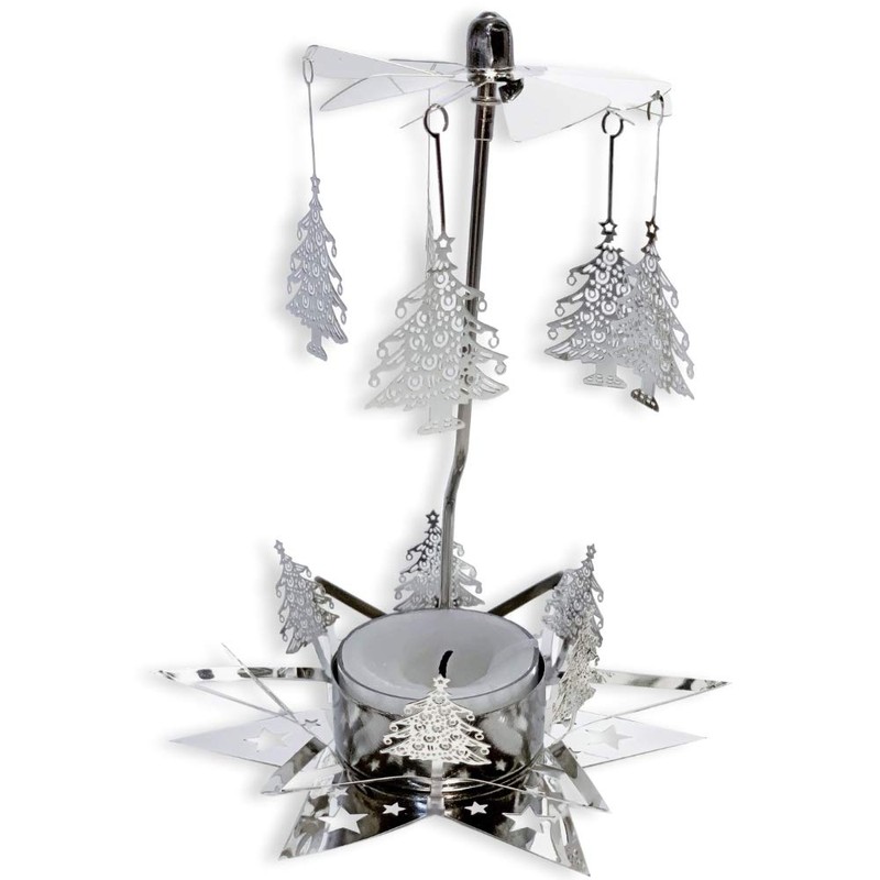 - SILVER CHRISTMAS TREE CANDLE HOLDER. Beautiful silver christmas trees spin around from the flame of a small tea light