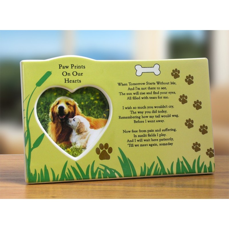 - CERAMIC PICTURE FRAME for the loss of a dog. Frame measures approx. 8"W X 5"H and comes with an easel back. Fits a 3" X 3" photograph of your loving pet.