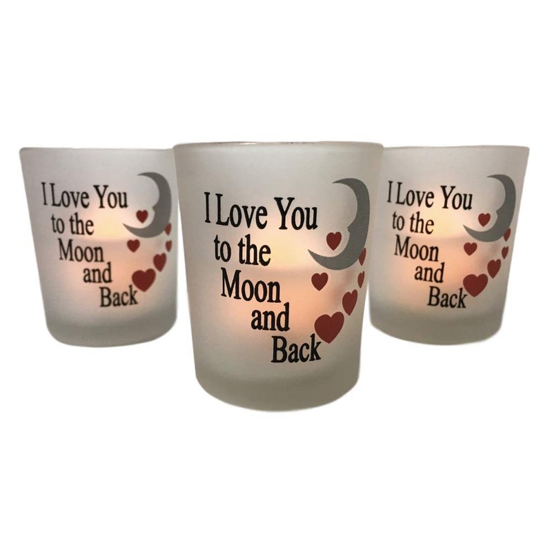 - I LOVE YOU TO THE MOON AND BACK. Each candle holder is decorated with the words I LOVE YOU TO THE MOON AND BACK with red hearts & silver moon. They are printed on the front and the back so the saying and design is visible from any direction. When the candles are turned on, they frosted glass in the holders gives just the right light off. This set would be a great addition in a Baby's room.