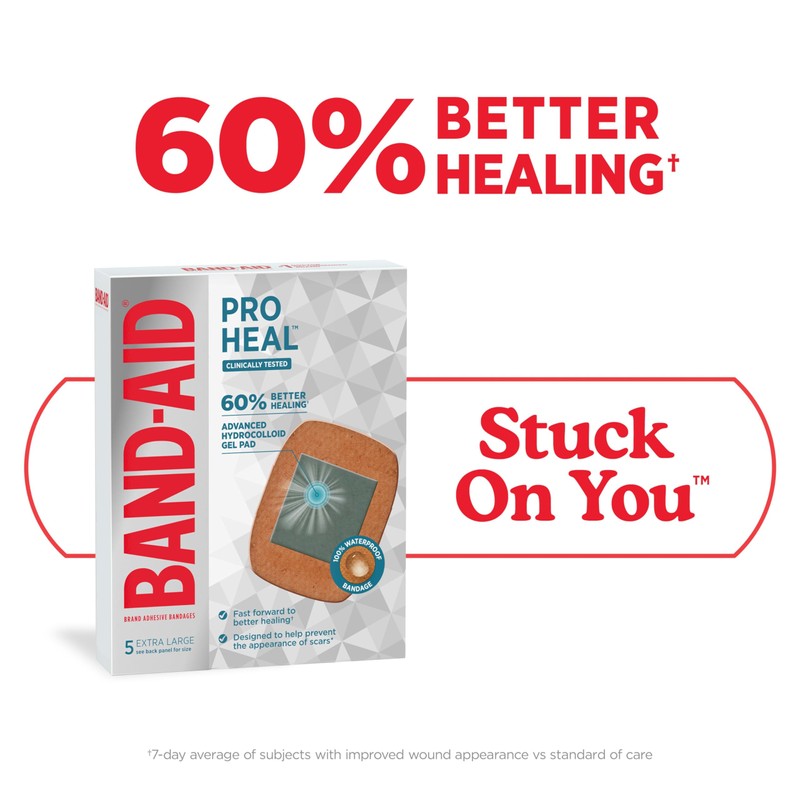 • 5-count package of Extra Large Band-Aid Brand Pro Heal Self Adhesive Bandages with Hydrocolloid Gel Pads, 100% waterproof bandages to help your minor wounds, cuts & scrapes heal better