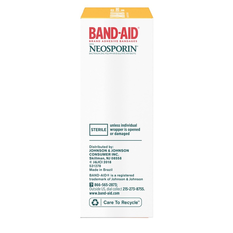 Get mess-free infection protection with Band-Aid Brand Adhesive Bandages Infection Defense with Neosporin. In assorted sizes, these sterile bandages have Neosporin antibiotic ointment right on the pad, and provide a 4-sided seal that protects against dirt & germs that may cause infection & delay healing. These Band-Aid Brand Adhesive Bandages also have a Hurt-Free Pad that won't stick to the wound, allowing for gentle removal. This package contains 20 antibiotic bandages in a variety of sizes.