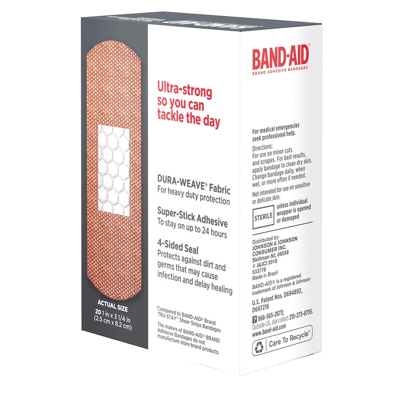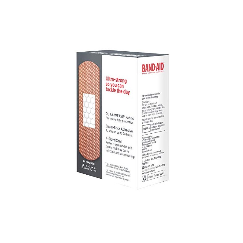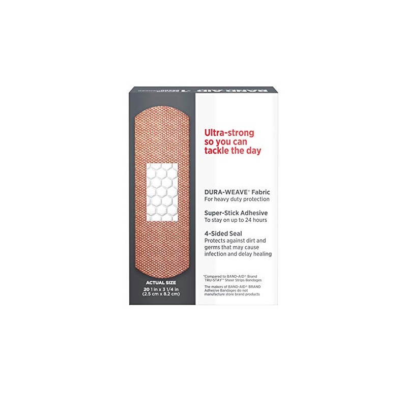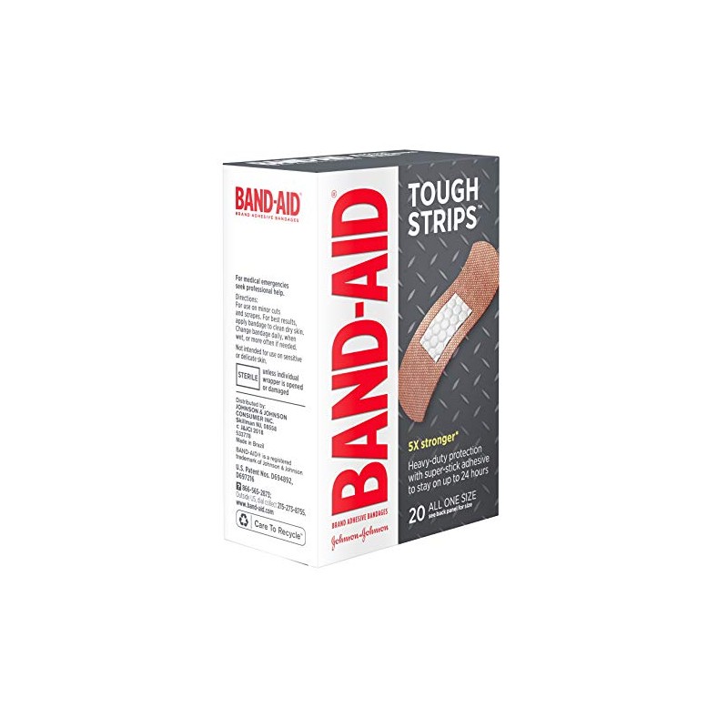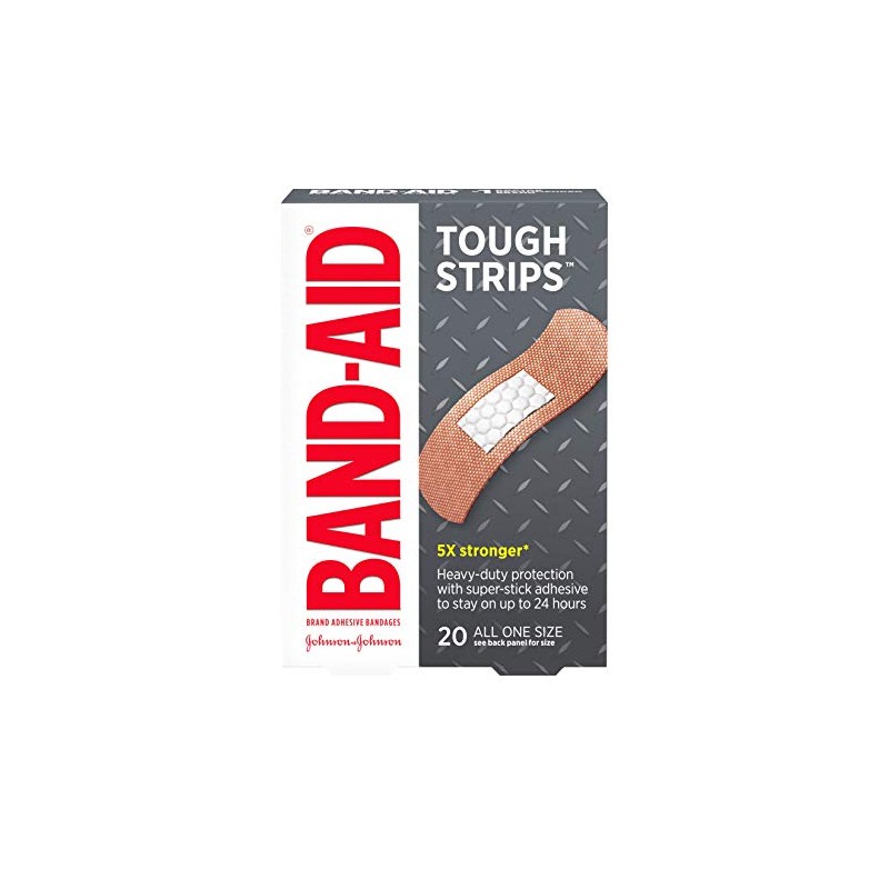 Band-Aid Brand Tough Strips Extra Durable Adhesive Bandages provide heavy duty durable wound care protection that stays with you all day. These extra durable Band-Aid adhesive bandages are 5 times stronger than ordinary bandages (compared to Band-Aid Brand Tru-Stay Sheer Strips). Band-Aid Brand Tough Strips Extra Durable Adhesive Bandages have a non-stick pad that won't stick to the wound. Please note that while Band-Aid Brand Tough Strips are ideal for use as first aid supplies, they are not recommended for sensitive or delicate skin. This package contains 20 heavy-duty sterile bandages, each measuring 1.75 by 4 inches.