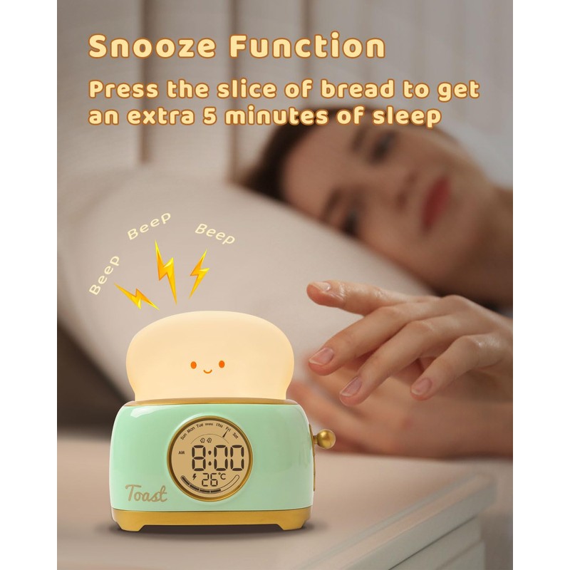 - đ„Șă3 Alarms and SnoozeăThe Toast Alarm Clock can set 3 alarms. Both you and your child can set the alarm freely according to your needs without worrying about missing anything important. When the digital alarm clock sounds, press the orange at the top to enter snooze mode and get an extra 5 minutes of sleep.