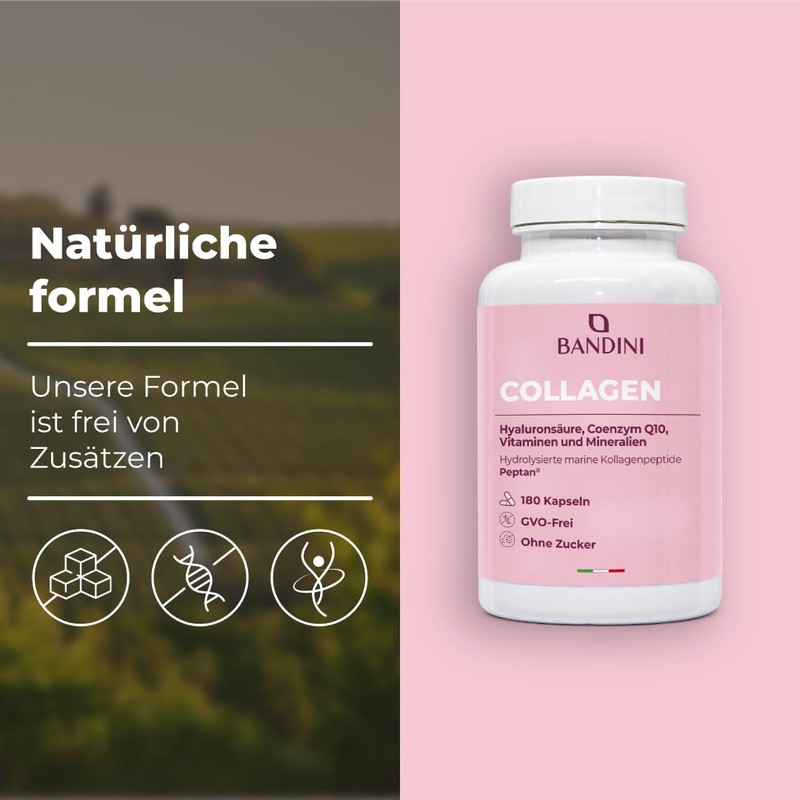- VERZEHREMPFEHLUNG. Die wohltuende Wirkung wird durch die Einnahme von 3 leicht zu schluckenden Kapsel t?glich mit Wasser erzielt. Jede Packung enth?lt 180 Kapseln fr einen 60-Tage-Vorrat. Jede Tagesdosis ist hochdosiert und enth?lt: 1000 mg hydrolysiertes marines Kollagen Peptan , 200 mg Hyalurons?ure, 25 mg Vitamin C, 20 mg Coenzym Q10, 5 mcg Vitamin D, 2,5 mcg Vitamin B12, 150 mcg Biotin, 55 mcg Selen, 800 mcg Kupfer, 800 mcg Vitamin A, 6 mg Vitamin E, 70 mg Magnesium, 10 mg Zink.
