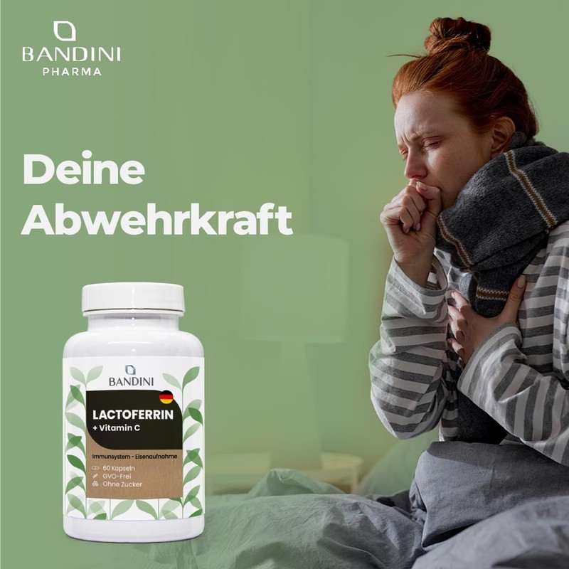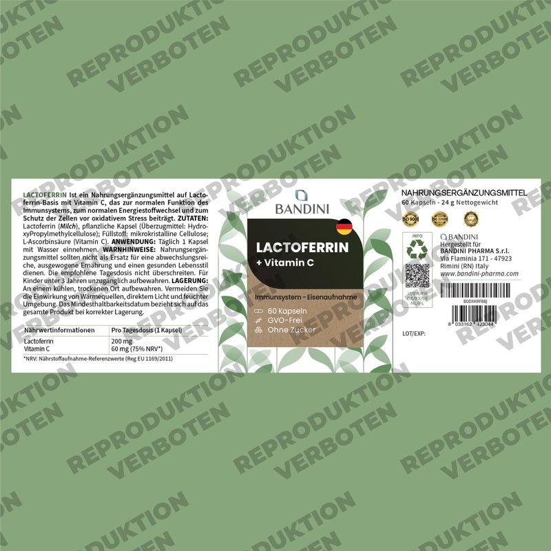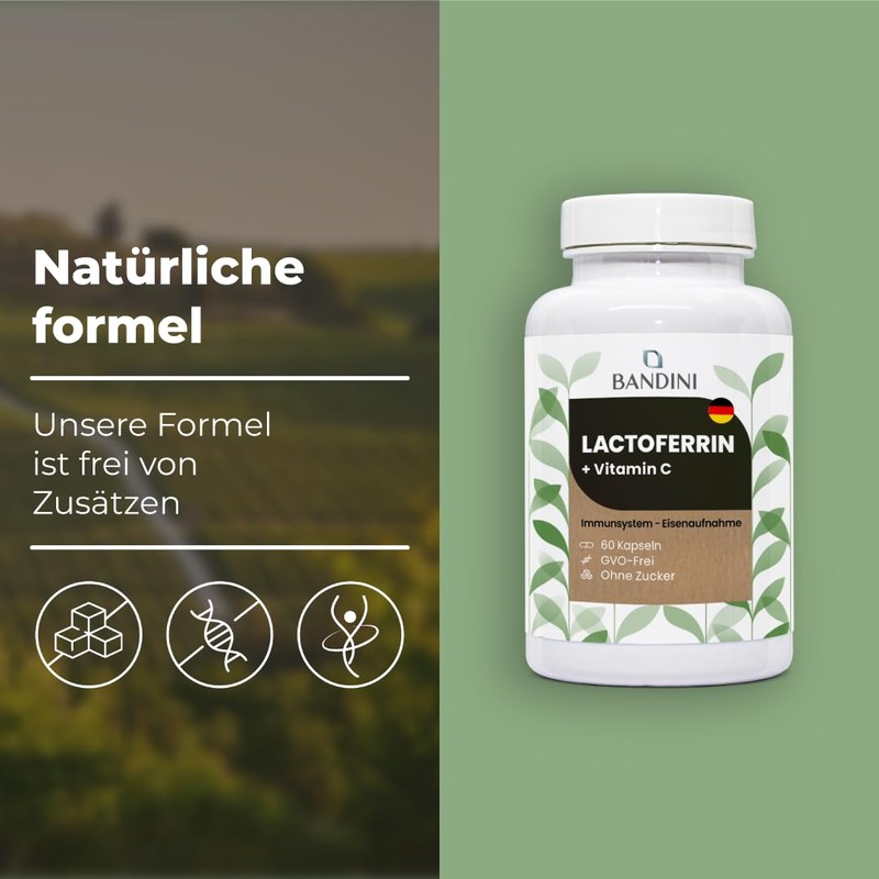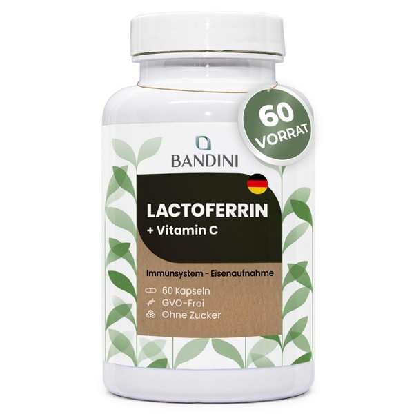 Bandini® Lactoferrin, 200 mg lactoferrin + 60 mg vitamin C (1 capsule per day), 60 capsules for 2 months, for iron absorption and immune system, colostrum ingredient, high dose, GMO-free