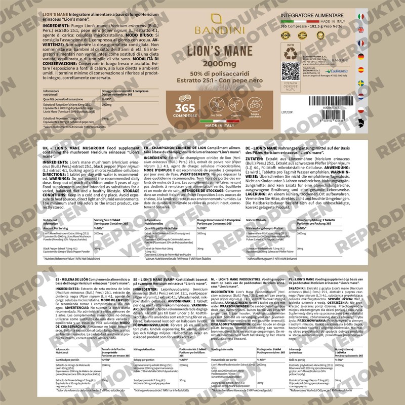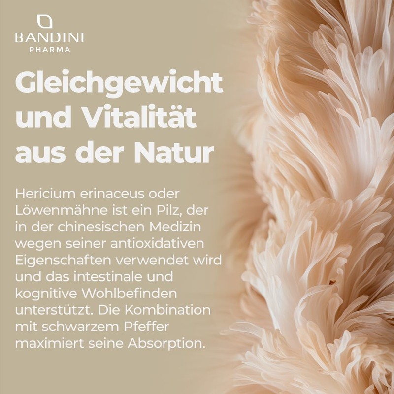 Bandini® Lions Mane Mushroom - Löwenmähne Pilz (25:1-Extrakt) - 365 Tabletten - Hericium Erinaceus 2000mg Tagesdosis - 1 Jahr Vorrat, Nur 1 Tab./Tag - Mit schwarzem Pfeffer - 50% Polyphenole - Vegan