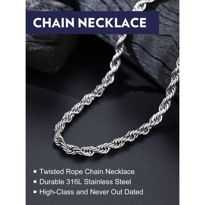 Bandmax 6MM Rope Chain Choker Necklace 18 Inch Hypoallergenic Waterproof Stainless Steel Silver Tone Chunky Cable Twisted Chain for Men Women Jewelry Gift