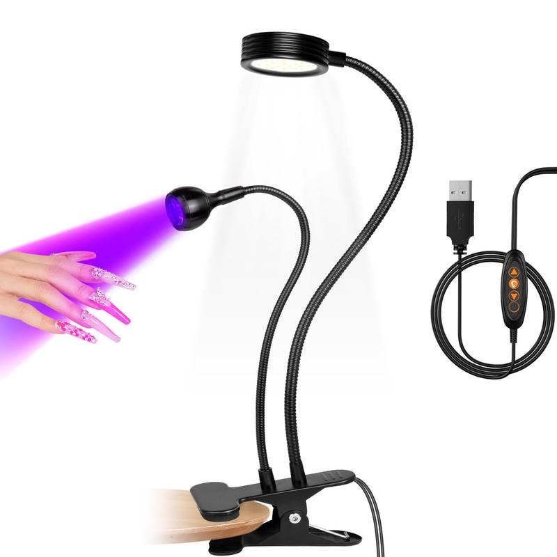 - Adjustable goose neck and clip device: the goose neck UV nail lamp can be firmly attached to tables and rotated 360°. Durable clamp with non-slip padding ensures stable grip on bedside table, desk, laptop table or headboard. The extendable arm allows targeted lighting of individual nails without annoying hand movements.