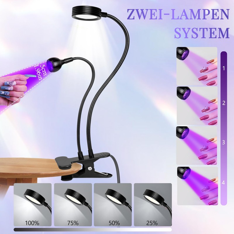 - Professional double LED UV lighting: double head UV lamp nails combines 365 + 395 nm purple UV wavelengths with 48 W white LED light. UV head mini UV lamp for nails ensures quick drying of gel polish in 30-60 seconds on salon quality. LED head with 4 brightness levels reduces colour distortion - perfect for complex nail tip art or even reading.