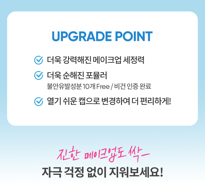 | 사용할 때 주의사항 | 1. 화장품 사용 시 또는 사용 후 직사광선에 의하여 사용부위가 붉은 반점, 부어오름 또는 가려움증 등의 이상 증상이나 부작용이 있는 경우에는 전문의 등과 상담할 것 2. 상처가 있는 부위 등에는 사용을 자제할 것 3. 보관 및 취급 시 주의사항 1) 어린이의 손이 닿지 않는 곳에 보관할 것 2) 직사광선을 피해서 보관할 것 4. 눈에 접촉을 피하고 눈에 들어갔을 때는 즉시 씻어낼 것 |