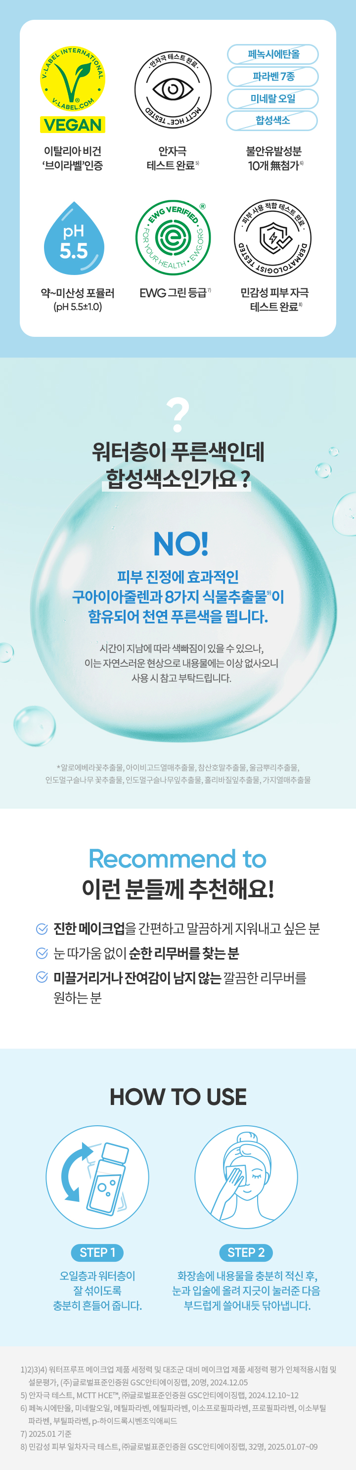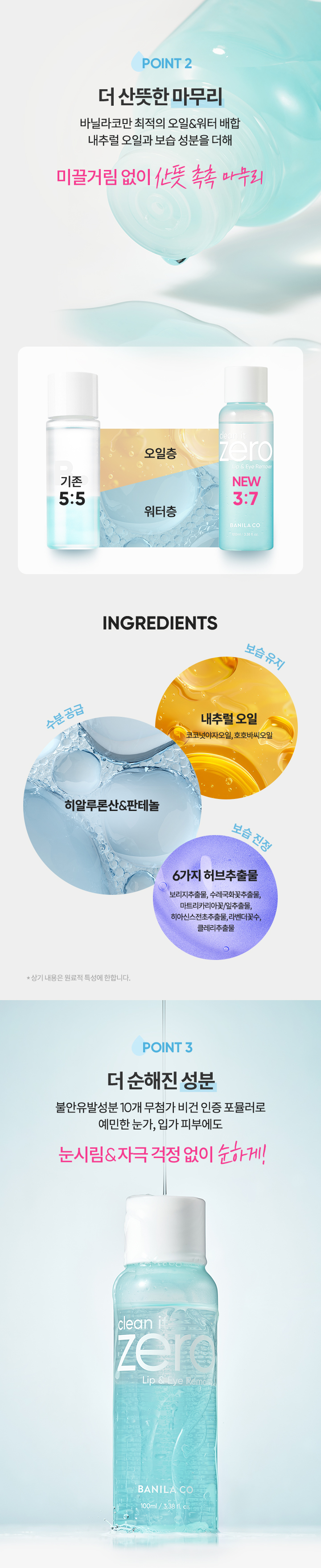 | 사용방법 | 1. 오일층과 워터층이 잘 섞이도록 충분히 흔들어 줍니다. 2. 화장솜에 내용물을 충분히 적신 후, 눈과 입술에 올려 지긋이 눌러준 다음 부드럽게 쓸어내듯 닦아냅니다.*눈과 입에 들어가지 않도록 주의해 주세요. |