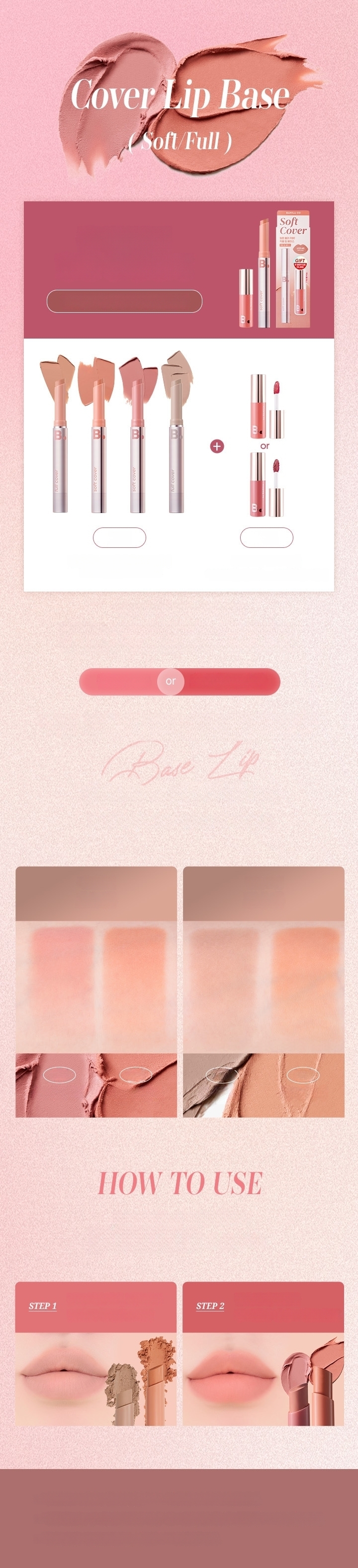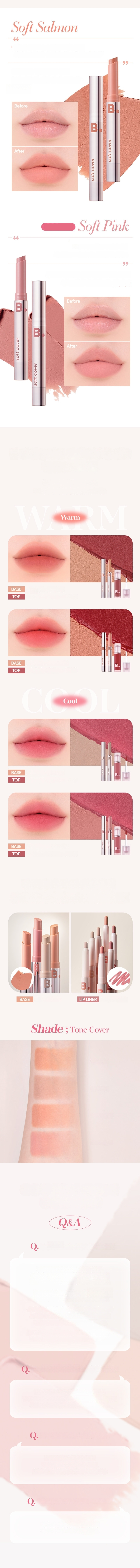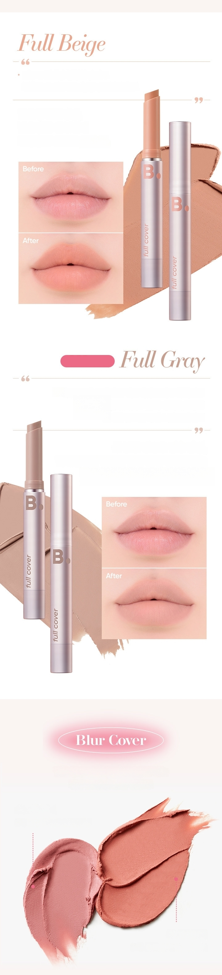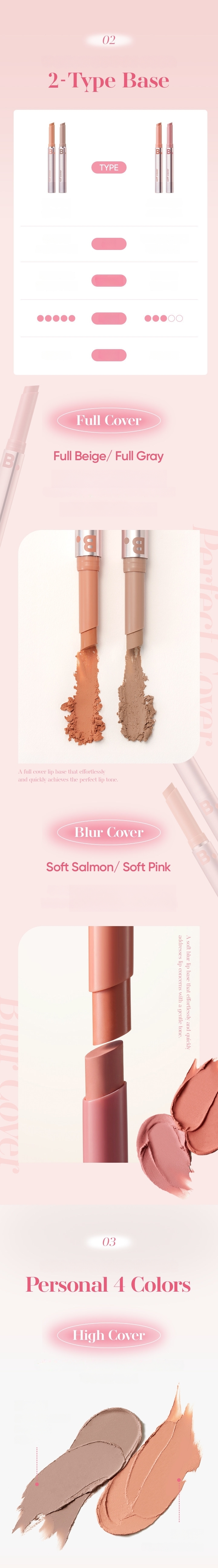 The stick type product that has perfect shape and angle for your lips allows easy and quick even lip makeup. The full beige and full grey shades are recommended for those who want vivid lip makeup or have dark lip shade. The soft salmon and soft pink shades provide soft application and nice coverage for easy and comfortable improvement of lip tone for makeup beginners. The high cover shade provides excellent coverage of dark lip shade and any lip troubles.