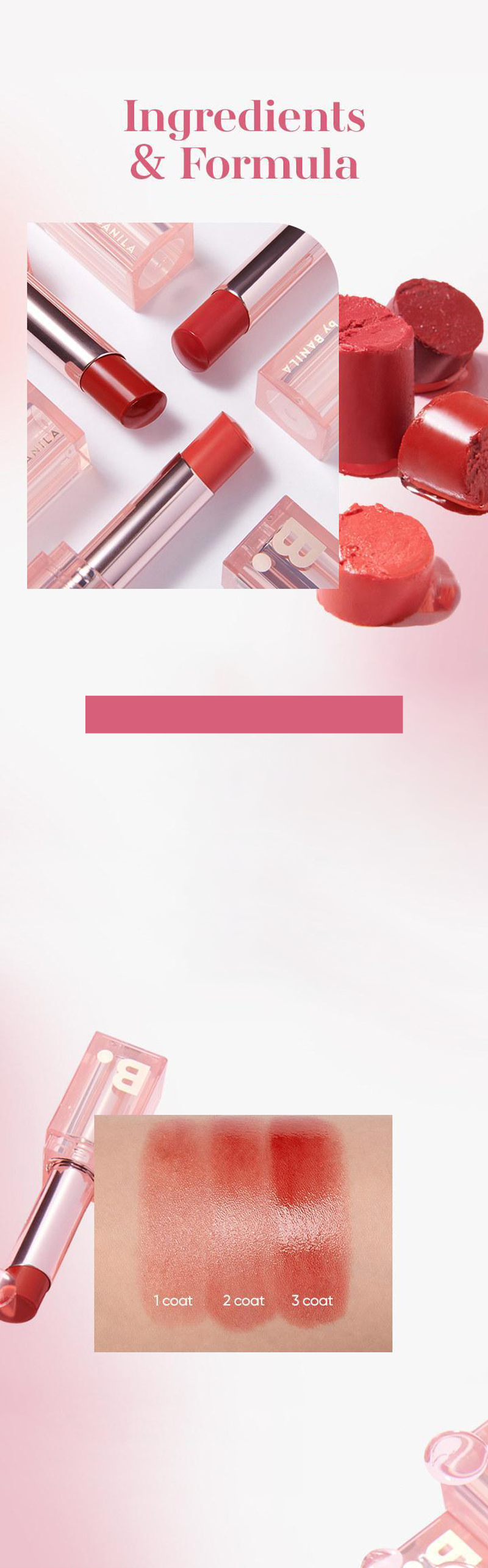 - Ingredients: [CK01 Sugar Coral] Squalane, Propylene Glycol Dibenzoate, Trimethylsiloxyphenyl Dimethicone, Dipentaerythrityl Tetraisostearate, Diphenyl Dimethicone, Hydrogenated Polyisobutene, Synthetic Wax, Bis-Diglyceryl Polyacyladipate-2, Pentaerythrityl Adipate/Caprate/Caprylate/Heptanoate, Tridecyl Trimellitate, Polyglyceryl-2 Triisostearate, Caprylic/Capric Triglyceride, VP/Eicosene Copolymer, Diglyceryl Sebacate/Isopalmitate, Diisostearyl Malate, Titanium Dioxide (CI 77891), Ethylene/Propylene Copolymer, Mangifera Indica (Mango) Seed Butter, Rosa Damascena Flower Oil, Rubus Idaeus (Raspberry) Seed Oil, Rosa Canina Fruit Oil, C10-18 Triglycerides, Polyethylene, Sorbitan Isostearate, Polyhydroxystearic Acid, Stearalkonium Hectorite, Polyglyceryl-2 Diisostearate, Ethylhexyl Palmitate, Isopropyl Myristate, Isostearic Acid, Lecithin, Propylene Carbonate, Adenosine, Polyglyceryl-3 Polyricinoleate, Tocopherol, Ascorbyl Dipalmitate, Fragrance, Hydroxycitronellal, Linalool, Citronellol, Geraniol, Tartrazine (CI 19140), Lithol Rubine BCA (CI 15850), Lithol Rubine B (CI 15850), Phloxine B (CI 45410), Iron Oxide Black (CI 77499), Sunset Yellow FCF (CI 15985) [BE01 Cozy Beige] Squalane, Propylene Glycol Dibenzoate, Trimethylsiloxyphenyl Dimethicone, Dipentaerythrityl Tetraisostearate, Diphenyl Dimethicone, Hydrogenated Polyisobutene, Synthetic Wax, Bis-Diglyceryl Polyacyladipate-2, Pentaerythrityl Adipate/Caprate/Caprylate/Heptanoate, Tridecyl Trimellitate, Polyglyceryl-2 Triisostearate, Caprylic/Capric Triglyceride, VP/Eicosene Copolymer, Diglyceryl Sebacate/Isopalmitate, Iron Oxide Red (CI 77491), Ethylene/Propylene Copolymer, Mangifera Indica (Mango) Seed Butter, Rosa Damascena Flower Oil, Rubus Idaeus (Raspberry) Seed Oil, Rosa Canina Fruit Oil, C10-18 Triglycerides, Polyethylene, Diisostearyl Malate, Sorbitan Isostearate, Polyhydroxystearic Acid, Stearalkonium Hectorite, Ethylhexyl Palmitate, Isopropyl Myristate, Isostearic Acid, Lecithin, Propylene Carbonate, Adenosine, Polyglyceryl-2 Diisostearate, Polyglyceryl-3 Polyricinoleate, Tocopherol, Ascorbyl Dipalmitate, Fragrance, Hydroxycitronellal, Linalool, Citronellol, Geraniol, Iron Oxide Yellow (CI 77492), Titanium Dioxide (CI 77891), Lithol Rubine BCA (CI 15850), Iron Oxide Black (CI 77499) [RD01 Love Me] Squalane, Propylene Glycol Dibenzoate, Trimethylsiloxyphenyl Dimethicone, Dipentaerythrityl Tetraisostearate, Diphenyl Dimethicone, Hydrogenated Polyisobutene, Synthetic Wax, Bis-Diglyceryl Polyacyladipate-2, Pentaerythrityl Adipate/Caprate/Caprylate/Heptanoate, Tridecyl Trimellitate, Polyglyceryl-2 Triisostearate, Caprylic/Capric Triglyceride, VP/Eicosene Copolymer, Diglyceryl Sebacate/Isopalmitate, Iron Oxide Red (CI 77491), Ethylene/Propylene Copolymer, Mangifera Indica (Mango) Seed Butter, Rosa Damascena Flower Oil, Rubus Idaeus (Raspberry) Seed Oil, Rosa Canina Fruit Oil, C10-18 Triglycerides, Polyethylene, Diisostearyl Malate, Sorbitan Isostearate, Polyhydroxystearic Acid, Stearalkonium Hectorite, Polyglyceryl-2 Diisostearate, Ethylhexyl Palmitate, Isopropyl Myristate, Isostearic Acid, Lecithin, Propylene Carbonate, Adenosine, Polyglyceryl-3 Polyricinoleate, Tocopherol, Ascorbyl Dipalmitate, Fragrance, Hydroxycitronellal, Linalool, Citronellol, Geraniol, Lithol Rubine BCA (CI 15850), Titanium Dioxide (CI 77891), Iron Oxide Yellow (CI 77492), Tartrazine (CI 19140), Iron Oxide Black (CI 77499) [PK01 Pink Pleasure] Squalane, Propylene Glycol Dibenzoate, Trimethylsiloxyphenyl Dimethicone, Dipentaerythrityl Tetraisostearate, Diphenyl Dimethicone, Hydrogenated Polyisobutene, Synthetic Wax, Bis-Diglyceryl Polyacyladipate-2, Pentaerythrityl Adipate/Caprate/Caprylate/Heptanoate, Tridecyl Trimellitate, Polyglyceryl-2 Triisostearate, Caprylic/Capric Triglyceride, VP/Eicosene Copolymer, Diglyceryl Sebacate/Isopalmitate, Diisostearyl Malate, Ethylene/Propylene Copolymer, Mangifera Indica (Mango) Seed Butter, Rosa Damascena Flower Oil, Rubus Idaeus (Raspberry) Seed Oil, Rosa Canina Fruit Oil, C10-18 Triglycerides, Polyethylene, Sorbitan Isostearate, Polyhydroxystearic Acid, Stearalkonium Hectorite, Polyglyceryl-2 Diisostearate, Ethylhexyl Palmitate, Isopropyl Myristate, Isostearic Acid, Lecithin, Propylene Carbonate, Adenosine, Polyglyceryl-3 Polyricinoleate, Tocopherol, Ascorbyl Dipalmitate, Fragrance, Hydroxycitronellal, Linalool, Citronellol, Geraniol, Titanium Dioxide (CI 77891), Iron Oxide Red (CI 77491), Phloxine B (CI 45410), Sunset Yellow FCF (CI 15985), Lithol Rubine BCA (CI 15850) [PP01 Mauve Moon] Squalane, Propylene Glycol Dibenzoate, Trimethylsiloxyphenyl Dimethicone, Dipentaerythrityl Tetraisostearate, Diphenyl Dimethicone, Hydrogenated Polyisobutene, Synthetic Wax, Bis-Diglyceryl Polyacyladipate-2, Pentaerythrityl Adipate/Caprate/Caprylate/Heptanoate, Tridecyl Trimellitate, Polyglyceryl-2 Triisostearate, Caprylic/Capric Triglyceride, VP/Eicosene Copolymer, Diglyceryl Sebacate/Isopalmitate, Ethylene/Propylene Copolymer, Diisostearyl Malate, Mangifera Indica (Mango) Seed Butter, Rosa Damascena Flower Oil, Rubus Idaeus (Raspberry) Seed Oil, Rosa Canina Fruit Oil, C10-18 Triglycerides, Polyethylene, Sorbitan Isostearate, Polyhydroxystearic Acid, Stearalkonium Hectorite, Polyglyceryl-2 Diisostearate, Ethylhexyl Palmitate, Isopropyl Myristate, Isostearic Acid, Lecithin, Propylene Carbonate, Adenosine, Polyglyceryl-3 Polyricinoleate, Tocopherol, Ascorbyl Dipalmitate, Fragrance, Hydroxycitronellal, Linalool, Citronellol, Geraniol, Iron Oxide Red (CI 77491), Fast Acid Magenta (CI 17200), Lithol Rubine BCA (CI 15850), Titanium Dioxide (CI 77891), Iron Oxide Yellow (CI 77492), Iron Oxide Black (CI 77499)