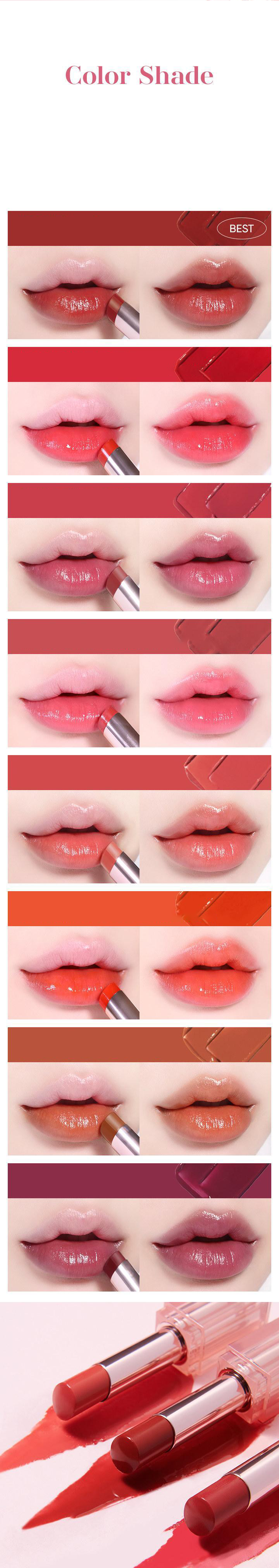 Expresses rich colors and elegant glossiness with a single touch. A wearable color product with beauty that blends in comfortably with any lips, whoever they may be. Creates an elegant shine that adheres smoothly to the lips without clumping. This is a high-fixing glow lipstick that overcomes the drawbacks of the previous compacted glow lipstick that melts and does not stick between lips without excessive bundling and stickiness, with a hydro balm formula. The color is expressed as it is, giving a clear and glossy color that becomes more vibrant without clumping as you layer it. According to reviews, this product has a smooth texture, a nice glossy finish with an elegant feel, good colorization, and all the colors are pretty. This is a moisturizing glow lipstick that shines with a rich, non-changing color just like when first applied. Elegant gloss that shines brightly, adheres smoothly to the lips without clumping, rich color that is fully felt, glow lipstick with wrinkle improvement functionality.