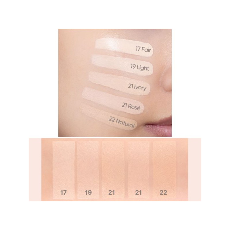 Covericious Ultimate Cushion Moisture SPF50+ PA+++: 17 Fair; 19 Light; 21 Ivory; 21 Rosé; 22 Natural