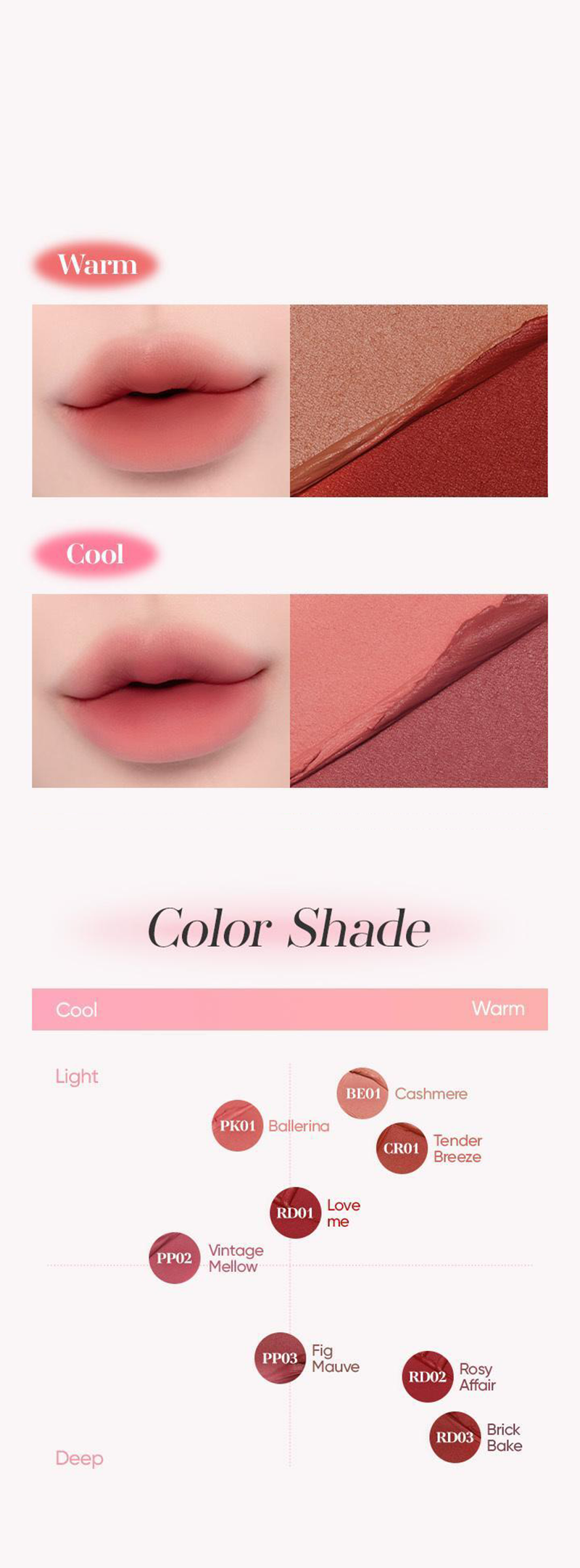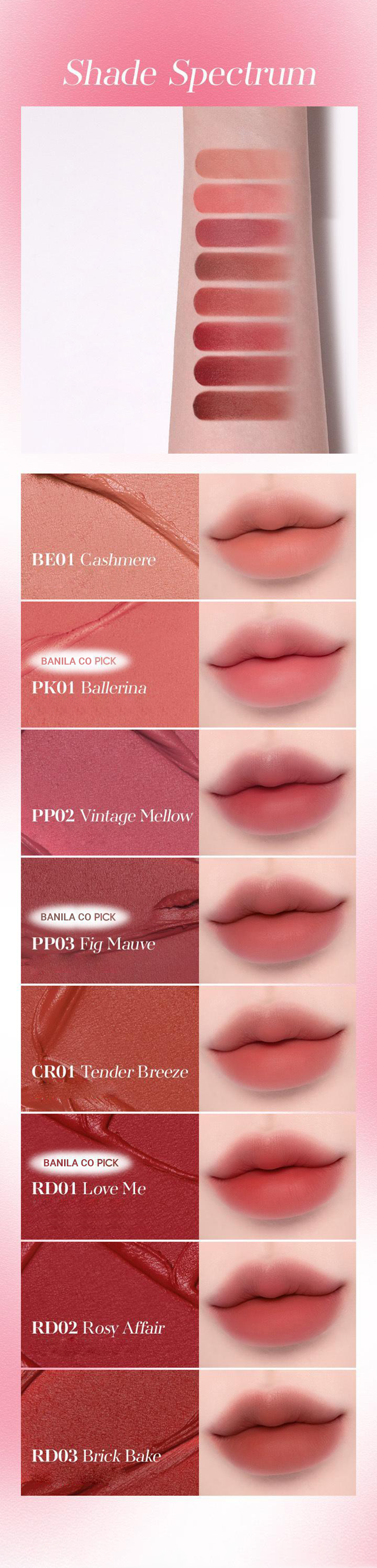 - Ingredients: [PP03 Fig Mauve] Dimethicone, Cyclopentasiloxane, Dimethicone Crosspolymer, Polyglyceryl-2 Triisostearate, Titanium Dioxide, Cyclohexasiloxane, 1,2-Hexanediol, Phenyl Trimethicone, Cetyl PEG/PPG-10/1 Dimethicone, Sunset Yellow FCF, Silica Silylate, Talc, Dimethicone/Vinyl Dimethicone Crosspolymer, Butyloctyl Salicylate, Iron Oxide Black, Tocopheryl Acetate, Lithol Rubine BCA, Iron Oxide Yellow, C30-45 Alkyl Dimethicone, Fragrance, Gossypium Herbaceum (Cotton) Seed Oil, Glycerin, Butyrospermum Parkii (Shea) Butter, Pentaerythrityl Tetra-di-t-butyl Hydroxyhydrocinnamate, Ceramide NP, Phytosphingosine [RD01 Love Me] Dimethicone, Cyclopentasiloxane, Dimethicone Crosspolymer, Polyglyceryl-2 Triisostearate, Cyclohexasiloxane, Iron Oxide Red, 1,2-Hexanediol, Phenyl Trimethicone, Cetyl PEG/PPG-10/1 Dimethicone, Iron Oxide Yellow, Silica Silylate, Talc, Titanium Dioxide, Dimethicone/Vinyl Dimethicone Crosspolymer, Lithol Rubine BCA, Butyloctyl Salicylate, Tocopheryl Acetate, C30-45 Alkyl Dimethicone, Fragrance, Gossypium Herbaceum (Cotton) Seed Oil, Glycerin, Butyrospermum Parkii (Shea) Butter, Pentaerythrityl Tetra-di-t-butyl Hydroxyhydrocinnamate, Ceramide NP, Phytosphingosine [PK01 Ballerina] Dimethicone, Cyclopentasiloxane, Dimethicone Crosspolymer, Polyglyceryl-2 Triisostearate, Titanium Dioxide, Cyclohexasiloxane, 1,2-Hexanediol, Phenyl Trimethicone, Cetyl PEG/PPG-10/1 Dimethicone, Silica Silylate, Talc, Dimethicone/Vinyl Dimethicone Crosspolymer, Butyloctyl Salicylate, Iron Oxide Red, Iron Oxide Yellow, Tartrazine, Tocopheryl Acetate, C30-45 Alkyl Dimethicone, Fragrance, Lithol Rubine BCA, Gossypium Herbaceum (Cotton) Seed Oil, Glycerin, Butyrospermum Parkii (Shea) Butter, Pentaerythrityl Tetra-di-t-butyl Hydroxyhydrocinnamate, Ceramide NP, Phytosphingosine [CR01 Tender Breeze] Dimethicone, Cyclopentasiloxane, Dimethicone Crosspolymer, Polyglyceryl-2 Triisostearate, Titanium Dioxide, Cyclohexasiloxane, 1,2-Hexanediol, Phenyl Trimethicone, Cetyl PEG/PPG-10/1 Dimethicone, Silica Silylate, Talc, Iron Oxide Red, Dimethicone/Vinyl Dimethicone Crosspolymer, Butyloctyl Salicylate, Sunset Yellow FCF, Tocopheryl Acetate, C30-45 Alkyl Dimethicone, Fragrance, Lithol Rubine BCA, Iron Oxide Black, Gossypium Herbaceum (Cotton) Seed Oil, Glycerin, Butyrospermum Parkii (Shea) Butter, Pentaerythrityl Tetra-di-t-butyl Hydroxyhydrocinnamate, Ceramide NP, [BE01 Cashmere] Dimethicone, Cyclopentasiloxane, Dimethicone Crosspolymer, Polyglyceryl-2 Triisostearate, Titanium Dioxide, Cyclohexasiloxane, 1,2-Hexanediol, Phenyl Trimethicone, Cetyl PEG/PPG-10/1 Dimethicone, Silica Silylate, Talc, Dimethicone/Vinyl Dimethicone Crosspolymer, Butyloctyl Salicylate, Sunset Yellow FCF, Iron Oxide Red, Tocopheryl Acetate, Iron Oxide Black, C30-45 Alkyl Dimethicone, Fragrance, Phloxine B, Lithol Rubine BCA, Gossypium Herbaceum (Cotton) Seed Oil, Glycerin, Butyrospermum Parkii (Shea) Butter, Pentaerythrityl Tetra-di-t-butyl Hydroxyhydrocinnamate, Ceramide NP, Tartrazine, Phytosphingosine [PP02 Vintage Mellow] Dimethicone, Cyclopentasiloxane, Dimethicone Crosspolymer, Polyglyceryl-2 Triisostearate, Titanium Dioxide, Cyclohexasiloxane, 1,2-Hexanediol, Phenyl Trimethicone, Cetyl PEG/PPG-10/1 Dimethicone, Silica Silylate, Talc, Dimethicone/Vinyl Dimethicone Crosspolymer, Butyloctyl Salicylate, Sunset Yellow FCF, Lithol Rubine BCA, Iron Oxide Red, Tartrazine, Tocopheryl Acetate, Iron Oxide Black, C30-45 Alkyl Dimethicone, Fragrance, Gossypium Herbaceum (Cotton) Seed Oil, Glycerin, Butyrospermum Parkii (Shea) Butter, Pentaerythrityl Tetra-di-t-butyl Hydroxyhydrocinnamate, Ceramide NP, Phytosphingosine [RD02 Rosy Affair] Dimethicone, Cyclopentasiloxane, Dimethicone Crosspolymer, Polyglyceryl-2 Triisostearate, Cyclohexasiloxane, Titanium Dioxide, Phenyl Trimethicone, 1,2-Hexanediol, Cetyl PEG/PPG-10/1 Dimethicone, Silica Silylate, Talc, Sunset Yellow FCF, Iron Oxide Red, Dimethicone/Vinyl Dimethicone Crosspolymer, Butyloctyl Salicylate, Lithol Rubine BCA, Tocopheryl Acetate, Iron Oxide Black, C30-45 Alkyl Dimethicone, Fragrance, Gossypium Herbaceum (Cotton) Seed Oil, Glycerin, Butyrospermum Parkii (Shea) Butter, Pentaerythrityl Tetra-di-t-butyl Hydroxyhydrocinnamate, Ceramide NP, Tartrazine, Phytosphingosine [RD03 Brick Bake] Dimethicone, Cyclopentasiloxane, Dimethicone Crosspolymer, Polyglyceryl-2 Triisostearate, Cyclohexasiloxane, 1,2-Hexanediol, Phenyl Trimethicone, Titanium Dioxide, Cetyl PEG/PPG-10/1 Dimethicone, Iron Oxide Red, Silica Silylate, Talc, Sunset Yellow FCF, Dimethicone/Vinyl Dimethicone Crosspolymer, Butyloctyl Salicylate, Iron Oxide Black, Lithol Rubine BCA, Tocopheryl Acetate, C30-45 Alkyl Dimethicone, Fragrance, Gossypium Herbaceum (Cotton) Seed Oil, Glycerin, Butyrospermum Parkii (Shea) Butter, Pentaerythrityl Tetra-di-t-butyl Hydroxyhydrocinnamate, Ceramide NP, Phloxine B, Tartrazine, Phytosphingosine