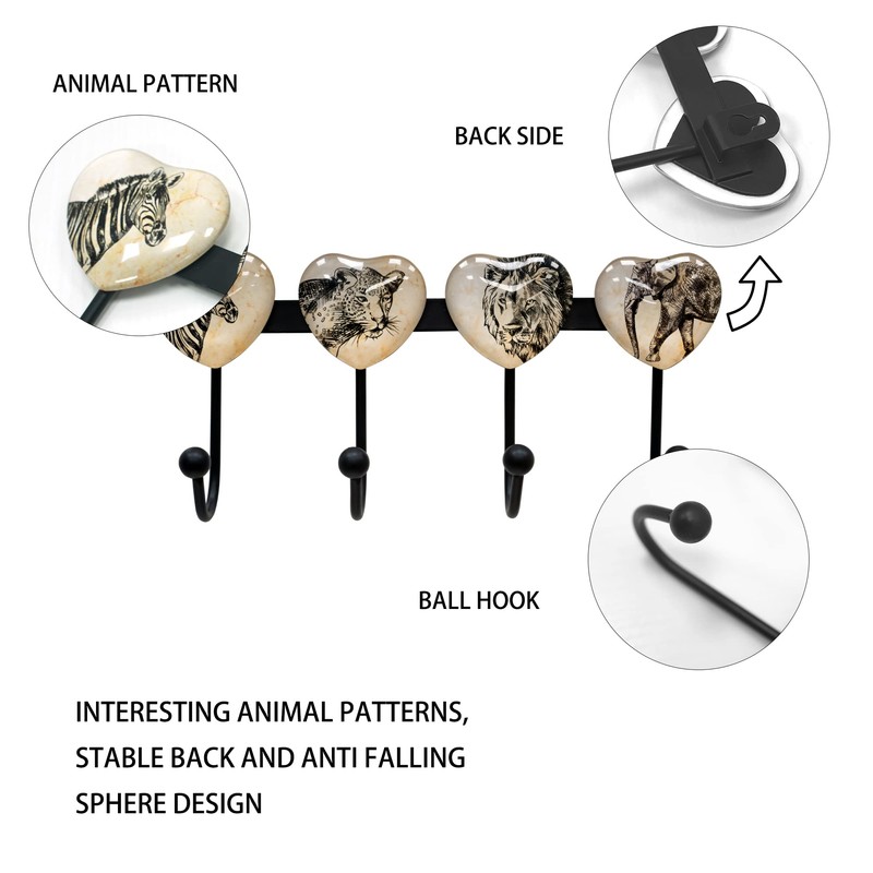Banllis Coat Rack Wall Mounted with 4 Hook, Heart Glass Finishes Animal Pattern Elephant Lion Zebra Leopard Decorative Wall Hooks for Entryway Hanging Hat, Key, Towel, Purse and Bag - Metal