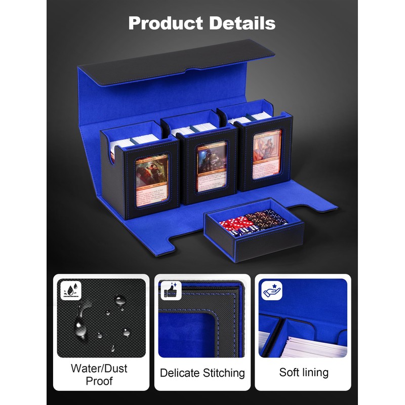 - 4-in-1 Card Deck Box: The magic deck box contains 3 individual deck boxes with display windows and a dice tray that holds 3*100 double-sleeved cards, 3*130 single-sleeved cards, and 3*230 unsleeved cards. The dice tray can be used to store dice, coins and counters
