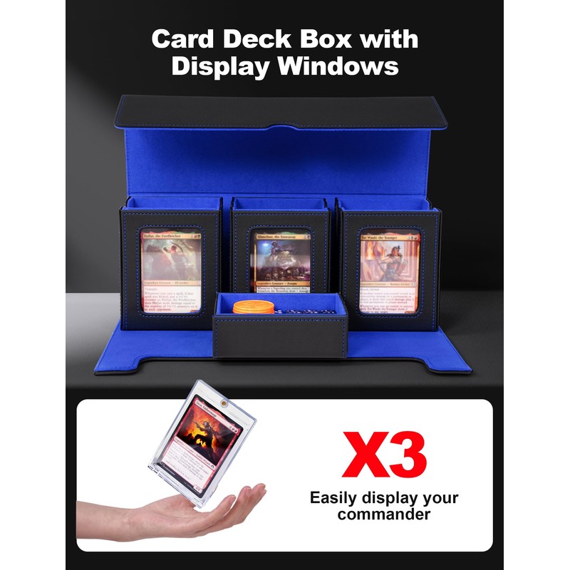 - Unique Design: Each individual card box comes with a display window, so you can show off your favorite commander using the 3 included magnetic card holders; the overall design of the card organizer box is fully detachable, allowing you to change the position of the card box and the dice tray; if you forget to bring your game playmat, this detachable lid can be used instead