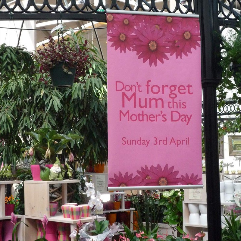 • A hanging display, banner hanger, and other banner holders can make do with all the unused ceiling space to great effect.