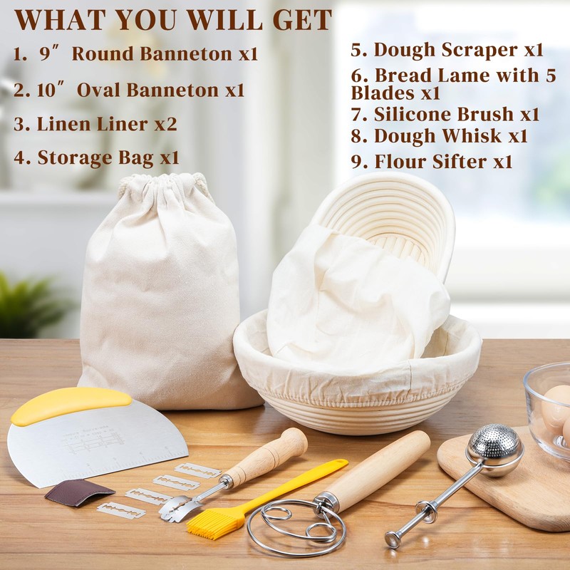 - What You Get: This complete banneton basket kit ensures you have everything you need to bake beautiful, professional-quality bread. The sourdough basket set comes with 9-inch round and 10-inch oval banneton baskets, a bread lame with 5 blades for making beautiful patterns, a stainless steel dough scraper, a danish dough whisk, a silicone bread brush, flour duster and a linen storage bag.