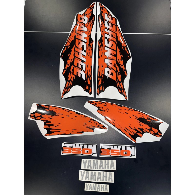 YAMAHA BANSHEE FULL GRAPHICS KIT... created from original oem graphics.....PRINTED ON HIGH QUALITY VINYL.... 14MIL THICK AND HIGH GLOSS...allow 2 days for printing and laminating...sometimes ship the same day... fast shipping!!