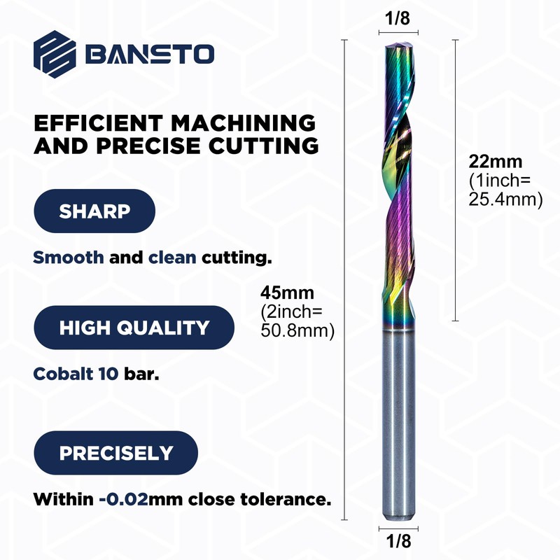BANSTO O Flute Upcut Spiral Router Bit 1/8 inch Shank, Carbide CNC End Mill for Plastic, Wood, Acrylic, Aluminum, PVC,Single Flute, 22mm Cut Length