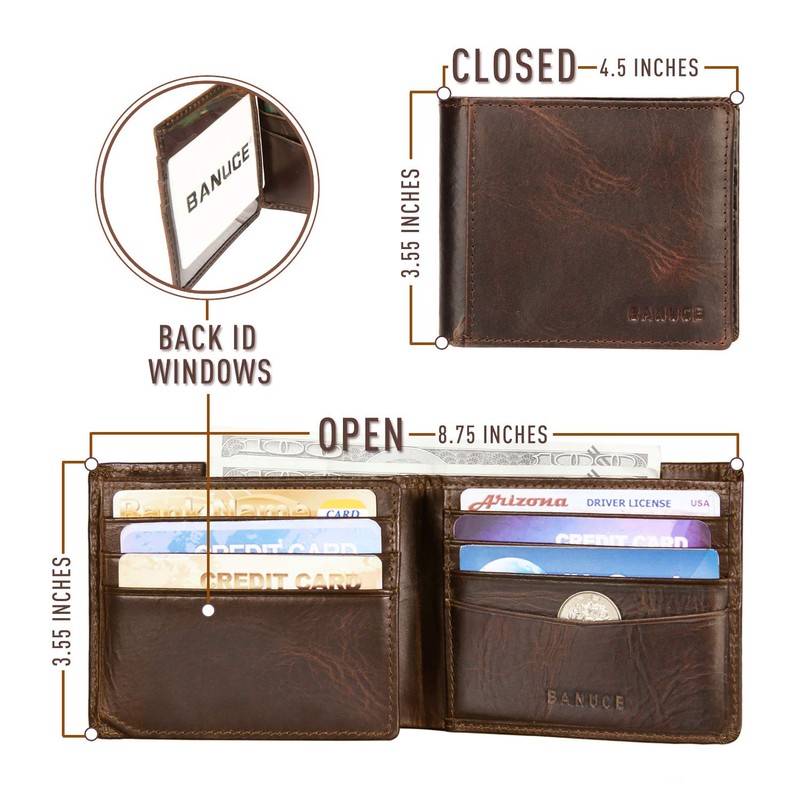 Banuce Full Grain Leather Men's Bifold Wallet with Card Holder Brown