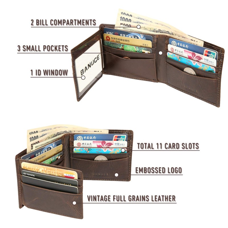 - Aside from 2 big bill pockets, it has up to 14 slots in total, including 11 regular card slots, 4 oversided card slots(one in the front flap) and 1 photo/ID window, holding plenty of cash and cards for you.