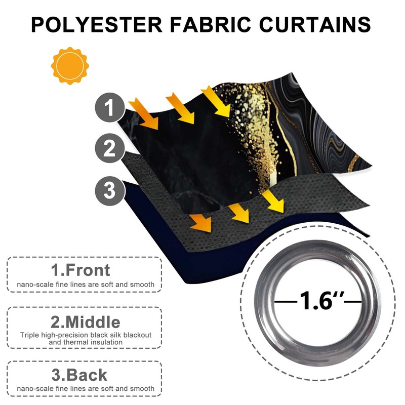 - 🤩【Package Includes】: Set of 2 panels of black and gold marble curtains; Each panel has 3/4/6/8 bright gray grommets with a 1.6" inner diameter, Fits well with most standard curtain rods. Suggest choosing the right size after measuring the windows