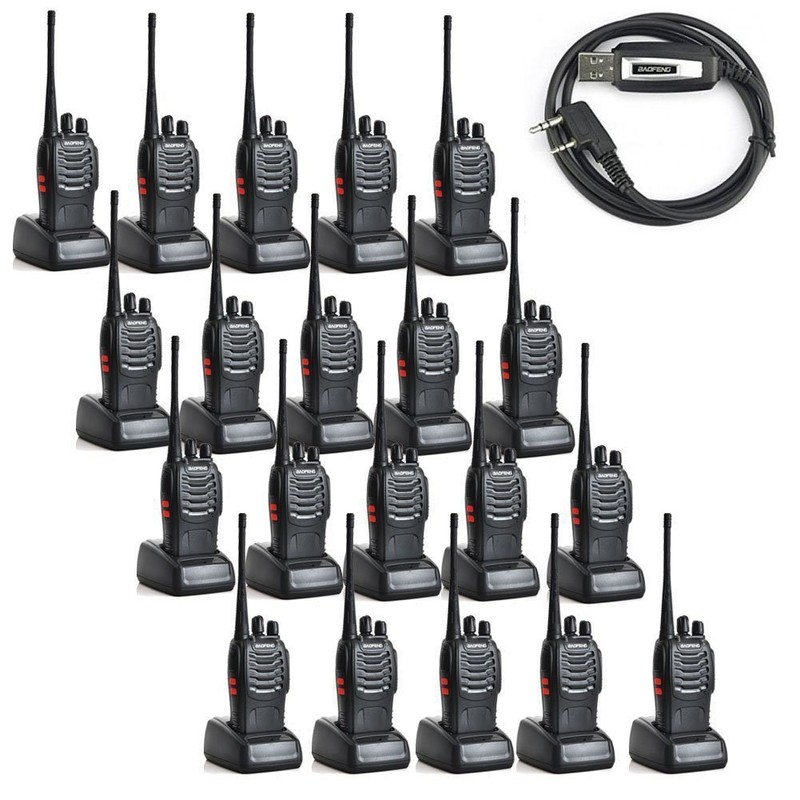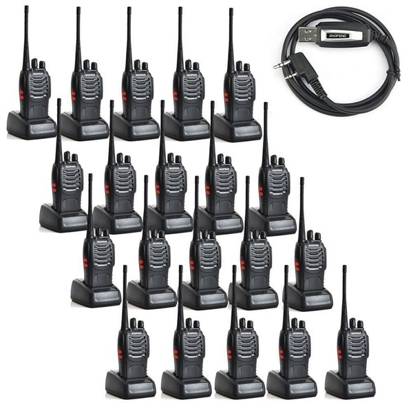 **Product Introductions:** 1\. A lightweight and compact communication device 2\. Provide you clear and loud sound 3\. Can be used to keep communication with partners or workmates 4\. Built with 1500mAh large capacity battery, 40-48 hours long working time 5\. Prevent users from receiving unauthorized signal and avoid the interference channel 6\. Up to 10km working range in open areas 7\. Suitable for many occasions, such as airports, manufacturing plants or concerts etc. **Product Details:** 1\. Color: Black 2\. Brand: Baofeng 3\. Model: BF-888S 4\. Quantity: 20 Piece 5\. Material: ABS 6\. Frequency Range: 400-470 MHz 7\. RF Output Power: 5W 8\. Channel: 16 9\. Talk Range: 5-10 km 10\. Battery Type: Lithium Battery 11\. Battery Capacity: 1500 mAh 12\. Standby Time: 50 Hour 13\. Working Time: 40 - 48 Hour 14\. Battery Life Theory: 10000 Hour 15\. Monitor Function: Yes 16\. Weight: 20.78oz / 589g 17\. Operating Voltage: 3.7V 18\. Frequency Stability: 2.5 ppm 19\. Dimensions: (4.72 x?.17 x 0.79)" / (12 x?.5 x 2)cm (L x W x H) **Package Includes:** 20 x Walkie Talkies 20 x Antennas 20 x 110~240V US Plug Power Adapters (110cm) 20 x English User Manuals 20 x 1500mAh Batteries 20 x Straps 20 x Belt Clips 20 x Pair of Earphones 1 x Program cable
